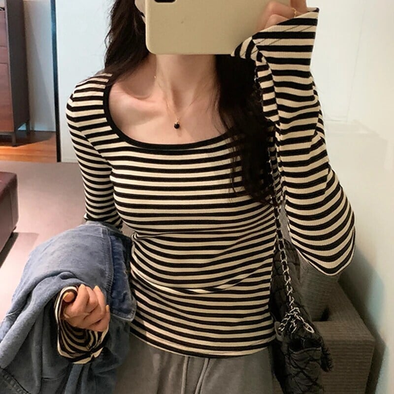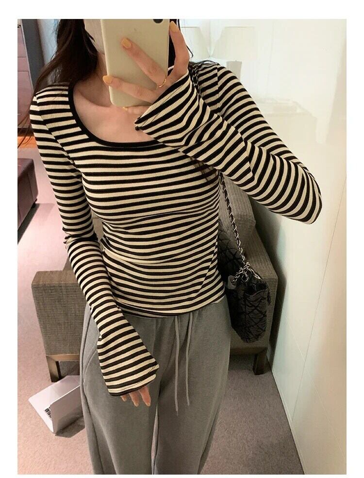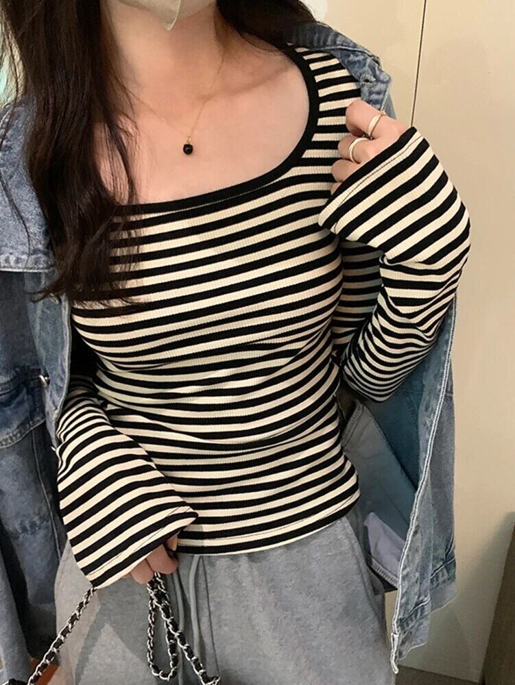 セクシースクエアカラー Tシャツ長袖 Tシャツストライプスリムトップススタイル Tシャツ 2024 春秋 ロング スプリング 春物 オータム 秋物 スクウェア