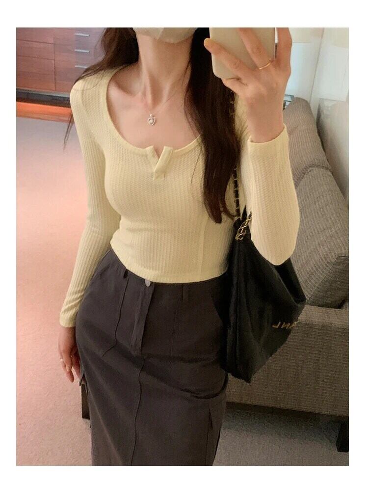Tシャツ長袖 Tシャツスリムホワイト Tシャツセクシー V ネッククロップトップススタイル 2024 春 ロング スプリング 春物 Vネック