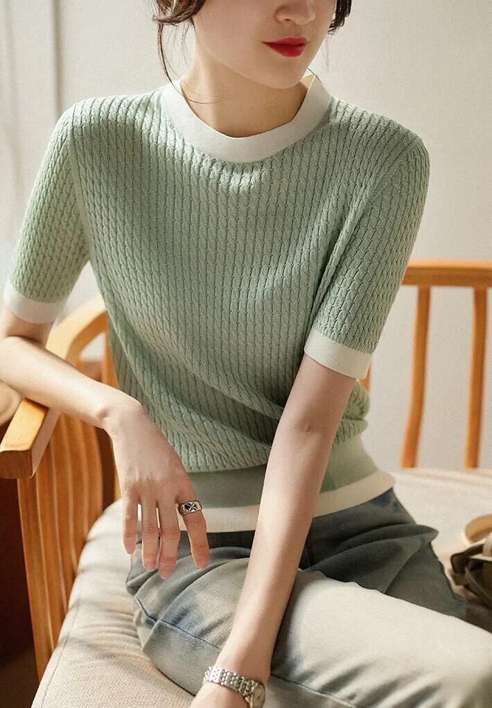 Tシャツニット O ネックルーズトップス夏 2024 コントラストカラー半袖 Tシャツ Tシャツ ショート ハーフスリーブ サマー 夏物 Oネック
